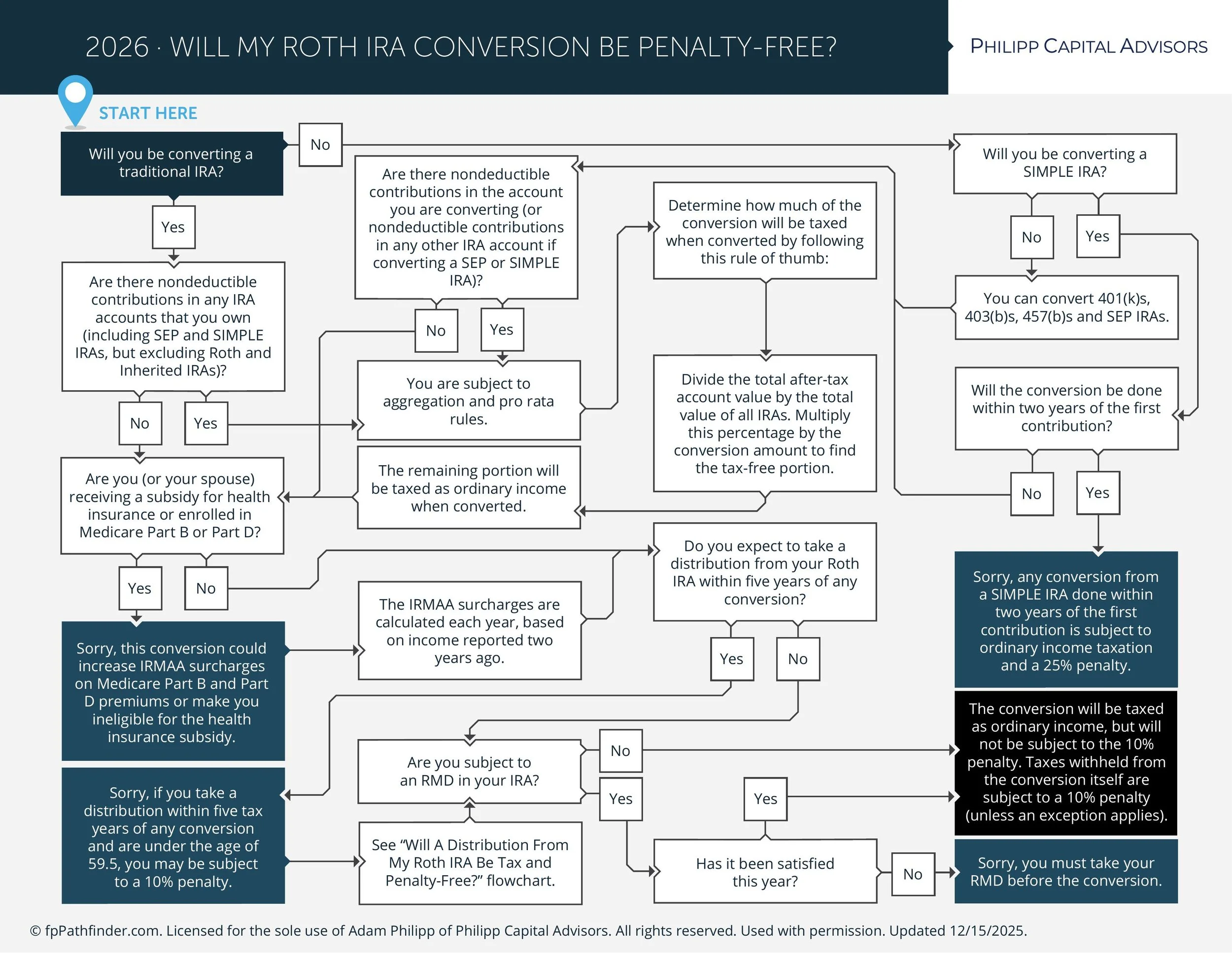 This week’s flowchart walks you through the decision tree: Will your Roth IRA conversion be penalty-free? It covers the critical questions most people miss: SIMPLE IRA timing rules, RMD requirements, the pro-rata trap, IRMAA surcharges, and the five-year rule that catches people who convert and then need the money too soon.
